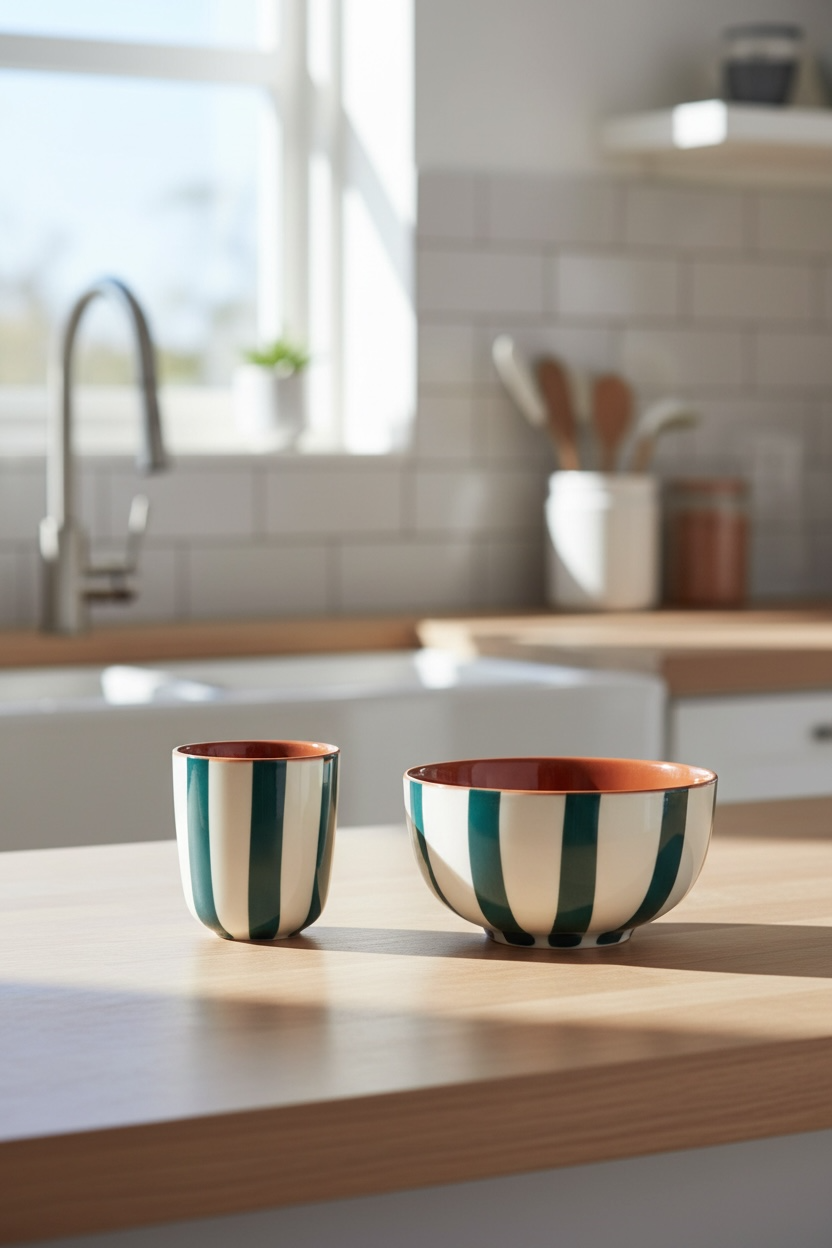 Apportez du caractère à votre table avec ce bol en grès rayé émeraude et blanc 35 cl, une pièce de vaisselle en grès à la fois esthétique et fonctionnelle. Son design rayé aux nuances vert émeraude profond et blanc lumineux sublime vos présentations, du petit-déjeuner aux soupes maison.