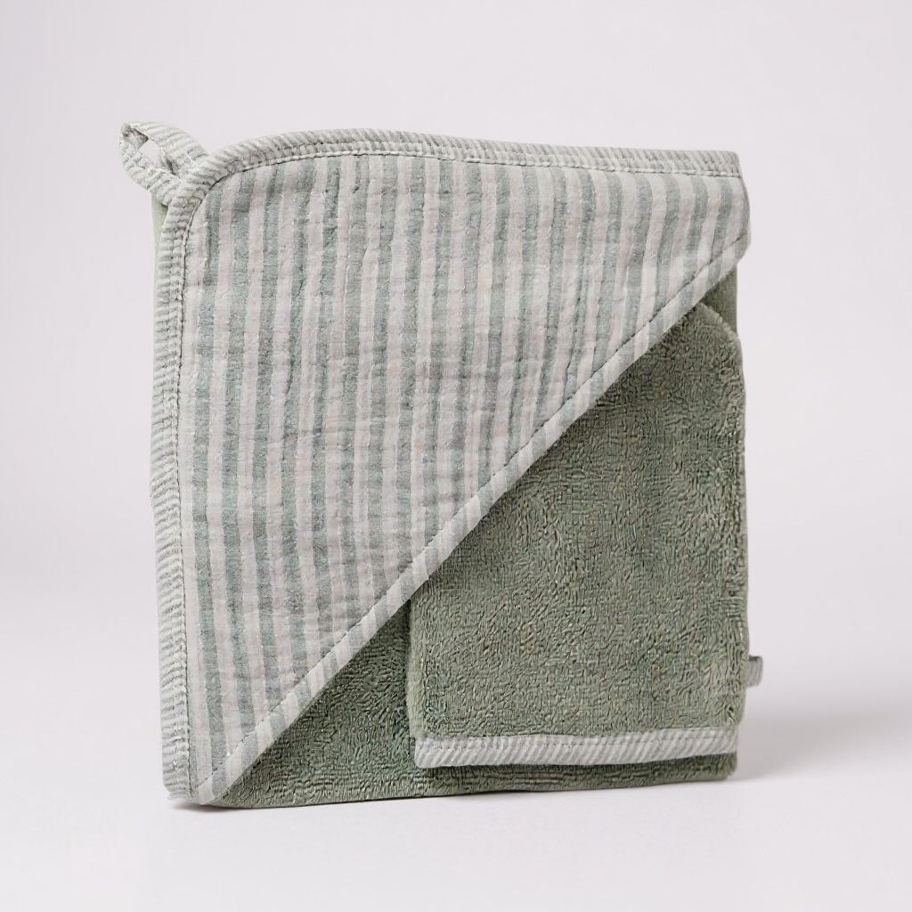 Cape de bain + gant assorti – Éponge bambou & gaze de coton rayée, Vert de Gris