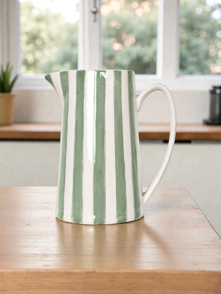 Apportez une touche de couleur et d’élégance à votre table avec ce pichet en céramique aux rayures blanc et vert matcha. Son design doux et naturel s’intègre parfaitement à tous les intérieurs, du plus moderne au plus bohème. Idéal pour servir de l’eau, des jus ou comme objet décoratif, il allie esthétique et praticité avec charme.
