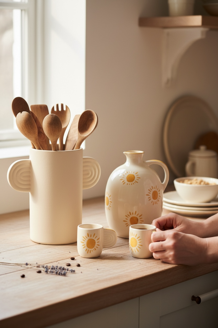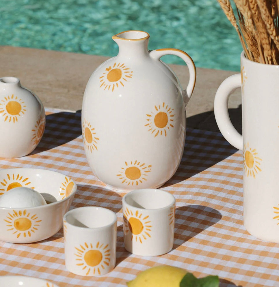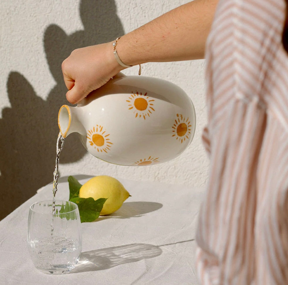 Le pichet en céramique est notre indispensable du quotidien : idéal pour servir de l'eau, préparer vos citronnades et thés glacés. Ce nouveau format, plus rond, amène de la douceur tout en gardant une touche d'originalité avec ses jolis soleils tamponnés à la main
