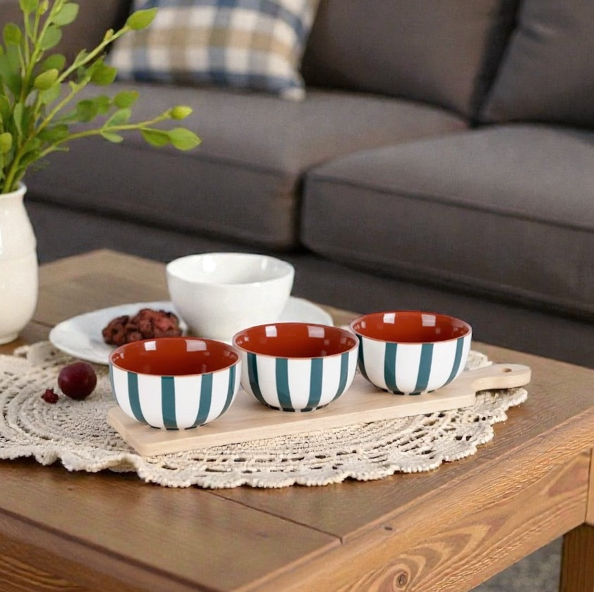Craquez pour cet ensemble à la fois naturel et élégant, composé d’une planche en bois d’hévéa et de trois coupelles en grès. Chaque coupelle est décorée de rayures blanches et vertes peintes à la main, ce qui rend chaque pièce unique.
