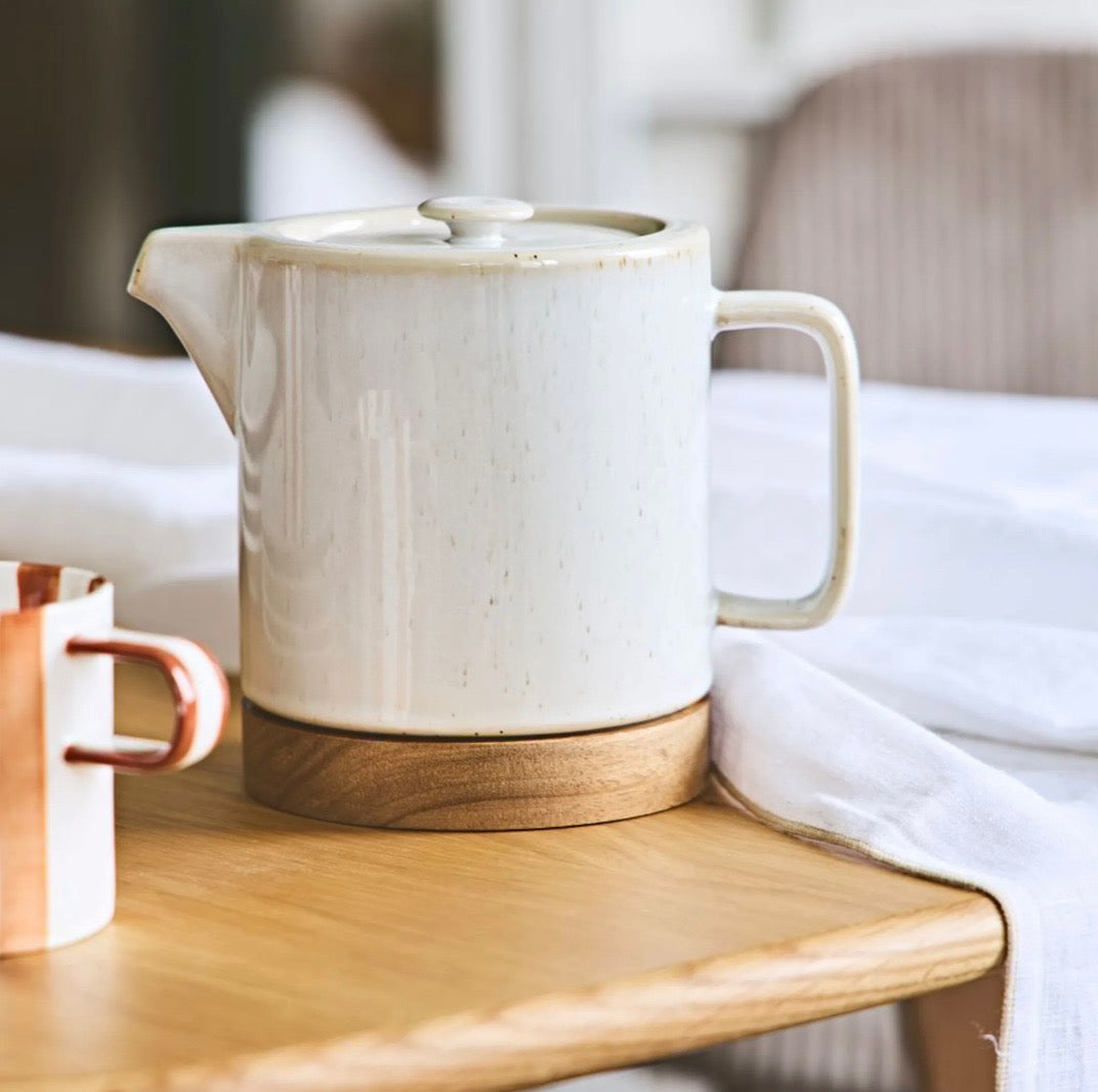 Théière avec filtre blanc moucheté 1.15l en grès et dessous en bois - nordika