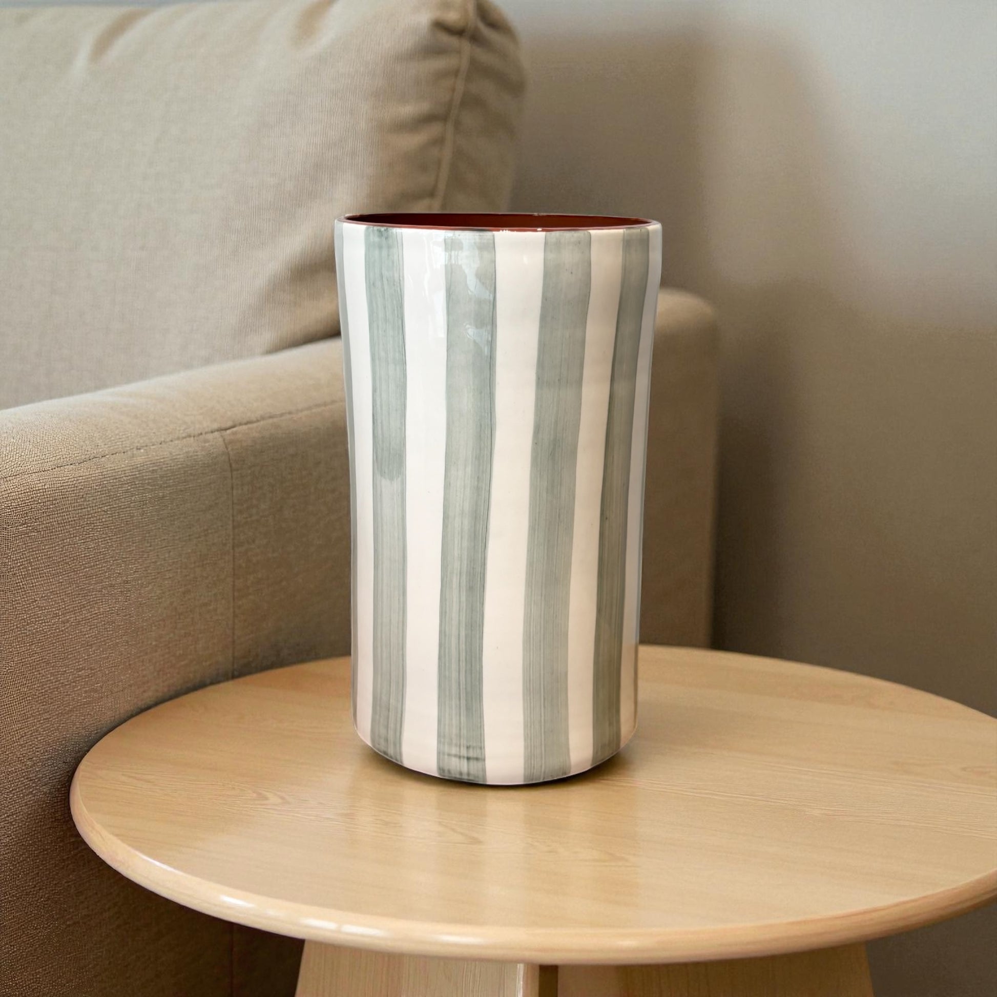Apportez une touche de douceur naturelle à votre intérieur avec ce vase en grès aux élégantes rayures vert sauge. Entièrement fait et peint à la main au Portugal, chaque pièce est unique et reflète un savoir-faire artisanal authentique.